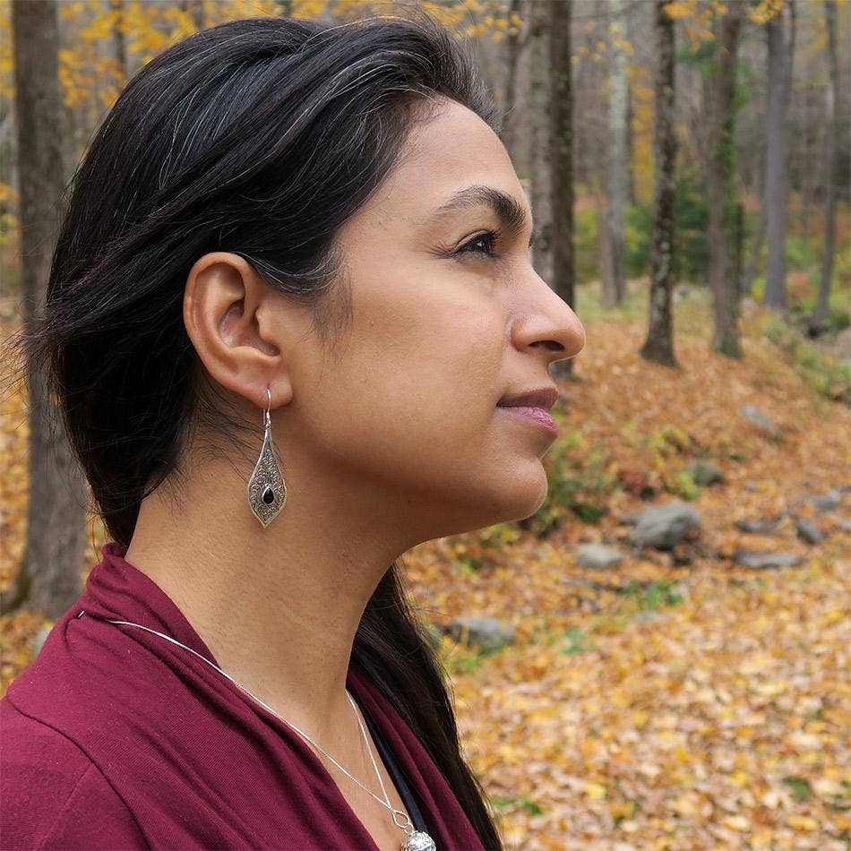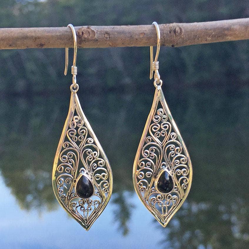 These exquisite sterling silver earrings are handmade by talented silversmiths in Bali. They feature a black onyx stone, representing protection, centered in traditional Balinese style filigree scroll work. Elegant and striking, these are one of our new favorites. Measures 2.2" long and .7" wide at its widest point. .925 Sterling silver All of our products are shipped with cards containing information about fair trade and the corresponding artisan group. ABOUT THE ARTISANS This jewelry was designed and handcrafted by a close-knit group of artisans who live and work together on a family compound in Bali. Bali silversmiths are renowned for a traditional and unique filigree style; these artisans pride themselves on honoring their culture while incorporating an innovative and modern touch with each piece they create. The intricate filigree styles are handmade by the women in the group. As one of the men in the community stated with a laugh: "the men don't have the patience."
