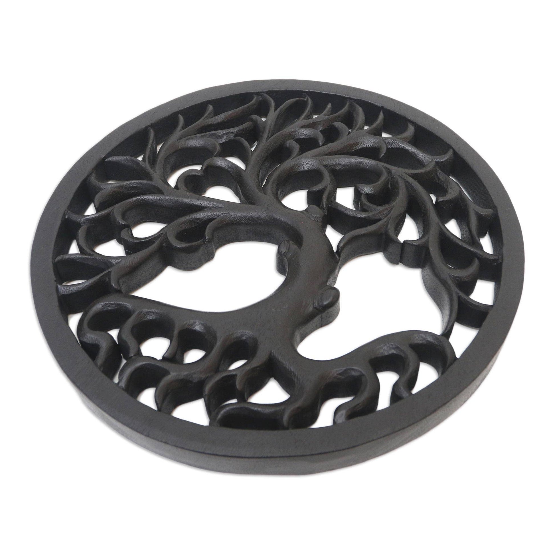 Using the ginseng tree for inspiration, Balinese artisan Made Mulyani designs and crafts this masterful relief panel. The artisan skillfully hand carves the beautiful tree from suar wood, centered in a round frame, while a black finish gives the panel and air of mystery.