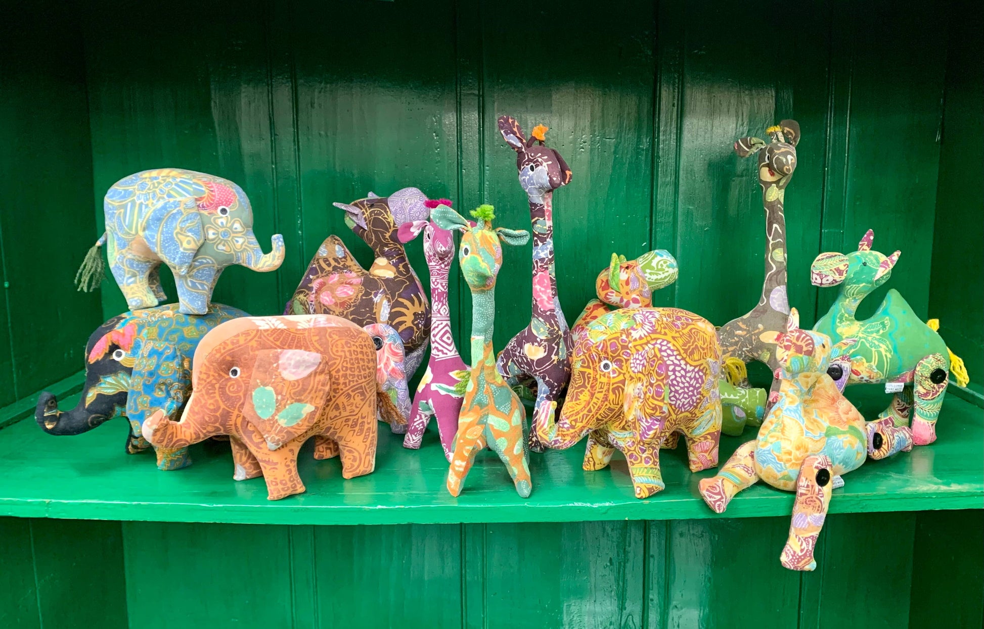 Crafted from colorful batik fabric, these plush giraffes make the perfect addition to a playroom or add a touch of whimsy to any room when displayed on a shelf or bookcase.