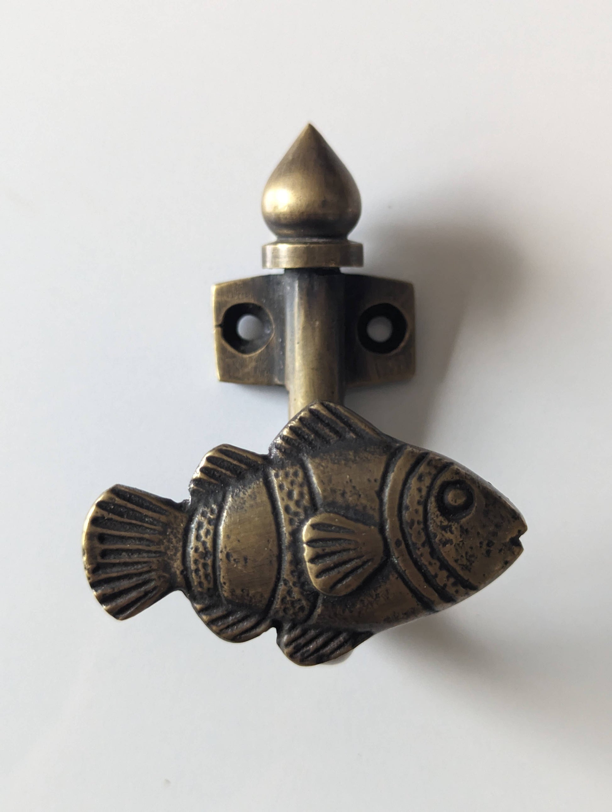 Dive into exquisite decor with our stunning Fish-Shaped Brass Hook, a captivating fusion of functionality and aquatic allure. Meticulously designed, this brass hook embodies the grace and beauty of the ocean, making it a charming addition to any space. Beyond its captivating aesthetics, this brass hook serves as a practical solution for organizing your space. Perfect for hanging towels, keys, jewelry, or small accessories, it adds a touch of marine charm while keeping your essentials within easy reach. By carefully handcrafting each Fish-Shaped hanger, talented local artisans from Indonesia ensure that each one is of the highest caliber and has a distinct personality. It is constructed with recycled copper and zinc from Indonesia. Dimensions: 3" x 2" Instructions: The hook features a hole in each side, making the process simple. To hang it on the hook, you will need to drill a hole in the surface where you plan to apply it. Made in Ubud, Bali, Indonesia